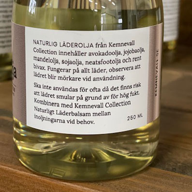 Läderoljan från Kemnevall Collection innehåller avokadoolja, jojobaolja, mandelolja, sojaolja, neatsfootolja samt bivax.